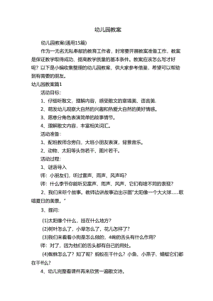 幼儿园教案幼儿园教案(通用15篇)作为一无名无私奉献的教育工作者,时常要开展教案准备工作,教案是保证教学取得成功、提高教学质量的基本条件。教案应该怎么写才好呢?以下是小编收集整理的幼儿园教案,供大家参考借鉴,希望可以帮助到有需要的朋友。幼儿园教案篇1活动目标:1、仔细听散文,理解内容,感受散文的意境美、语言美.2、萌发幼儿观察大自然的兴趣和热爱大自然的美好情感。3、愿意分角色表演简单的故事情节。4、理解散文内容,丰富相关词汇。活动准备:1、配班教师念旁白,大班小朋友表演,背景音乐。2、动物、太阳等头饰若干、图片若干。活动过程:1、谜语导入师:小朋友们,听过雷声、雨声、风声吗?师:什么季节你能听见雷声、雨声、风声,它们有啥不同的表现?2、我们来听个故事。教师边讲故事边出示图"太阳像一个大火球歌唱夏日的美景。"3、提问:(1)太阳像个什么,挂在什么地方?(2)树叶怎么了,小草怎么了,花儿怎样了?(3)我们来看看小狗是怎么做的,4峋的舌头有什么作用?师:对了,因为他们的舌头都有自己的用处。(4)蜘蛛怎么了?知了呢?蚂蚁在干什么?小鱼、小燕子、蜻蜓它们都在干ff么?4、幼儿完整看课件再来欣赏一遍散文诗。5、教师总结结束。师:通过欣赏你们知道夏日为什么会出现这种奇怪的自然现象吗?如果你们去发现的话会怎么想呢?反思:夏日讲述了夏天利益连贯的奇怪的自然现象,散文的句子优美、散文情节生动、有趣,耐人回味。让我们体验了开动脑筋、解决问题的愉快心情。以情境式表演引起幼儿兴趣,以这种讲述的形式,生动地展现了生动的情境。为帮助幼儿熟悉散文内容,教师设计了层层递进式的提问,将幼儿的注意导向对市局的表层信息和深层信息的感知和理解,通过生动有趣、层层递进的散文句子。调动了幼儿讨论的积极性。幼儿认知得到了扩展,情感得到了培养,语言的理解力得到了提高.幼儿园教案篇2【嗣目标】认识小麦,了解小麦的生长过程,会正确种植并关注、照料小麦的生长过程。通过实验培养互相礼让,学习分工合作的能力。在交流活动中能注意倾听并尊重同伴的讲话。【活动准备】小麦、种植园、小锄头、小铲子、洒水壶等。【活动建议】种植适合月份:11月份【活动过程】1、出示小麦,幼儿自由观察,了解小麦的外形及特征。师:小朋友多见过小麦吗?它长的什么样?让孩子自由讨论小麦的外形特征和组成部分。出示实物小麦,引导幼儿了解小麦的外形特征和组成部分,认识其根、茎、叶的形状;小麦的茎俗称麦秸,空心、有节、光滑、叶狭长;茎的顶端长麦穗,麦穗有针一样的麦芒,麦穗成熟时是金黄色的。2、提出种植任务:种小麦。讨论:怎样种?3、幼儿种小麦:松土用小锄头、小铲子把大块的土弄碎,将小麦撒到土里,用小铲子敲几下泥土,整平土地。浇水将周围的土淋湿。4、记录种植时间,并每周定期为小麦浇水,记录观察到的小麦生长状况,将情况记录在小麦生长日记中.小麦生长日记每页记录内容包括日期、天气、小麦生长状况等基本情况(配图).5、一个生长周期后,引导幼儿整理、装订"小麦生长日记",做成一本自己的"书"(附幼儿进行小麦种植步骤活动照片,及幼儿做成的一本小麦生长日记书).形式:个别操作。评价:正确种植小麦持之以恒照料小麦完成一个生长周期。幼儿园教案篇3今的孩子大多数是独生子女,在家里与同伴相处的机会少,与他人分享、合作,提供了关于幼儿园中班的教案课件,一起来借鉴吧!活动目标:1、理解故事内容,练习发"Zhang""SUO”的音,学习词语"长大"、"缩小"。2、能大胆于在集体面前说话。3、感受故事蕴含的幽默感,体验与同伴游戏的快乐。活动重点:理解故事内容,感受故事蕴含的幽默感,体验与同伴游戏的快乐.活动难点:练习发"Zhang"hSUOm的音.活动准备:米皮皮图片一幅,五彩小棍一根,米皮皮头饰一个,故事图片四张。活动过程:一、欣赏故事:1.出示米皮皮图片.小朋友们看,今天,教师请来了一只小老鼠来我们班做客,嗯,它叫米皮皮,我们一起来向米皮皮问好吧!(米皮皮好!)"小朋友们好!"2、米皮皮还带来了一样宝贝,叫“敲敲长"。小朋友们跟老师一起来念念看G长)。3、米皮皮的敲敲长是一根五颜拥六色很漂亮的4遍,我们就叫它五彩小棍吧!"五彩艰"我们一起说说看!4、刚才老师已经说了,这根五彩艰是米皮皮的宝贝,那么,它到底有什么用呢?我们一起听完故事就知道了。5、教师有表情地讲述故事一遍,(不借助图片)提问:(1)米皮皮有件什么宝贝叫什么呀?(请幼儿回答,并及时鼓励)(2)它是一根怎样的棍子呢?(五彩/J幅)(3)米皮皮的敲调长有什么用呢?(它能使物体长大事缩小)好,我们再来听一遍。6、再次讲述故事,帮助幼儿理解故事内容(借助图片)敲敲长使什么长在了?使什么缩小了!米皮皮是怎么说的呢?(长长长、缩缩缩)二、游戏现在,我们也来玩一个游戏,我来当"米皮皮"(带上头饰)1、这是我的“敲敲长",请小朋友来当"小豆苗、胡萝卜,小磨菇,还有狼婆婆,2、在玩游戏之前,米皮皮要告诉小朋友游戏的规则,你们一定要仔细听噢!3、当米皮皮用"敲敲长"敲到你的时候,你们就扭一扭身体向上长,还要说"啊哈,我长大了."好,我们一起来说说看,啊哈,我长大了!"4、当米皮皮用小木棍敲到你说:"缩缩缩"的时候,你就扭一扭身体,蹲下去,还要说:"唉啊,我缩小了。"我们也来学学看吧。"唉啊,璐!小了!